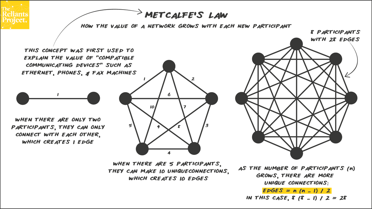 المثال الكلاسيكي هنا هو التليفون، لما التليفون بدأ، وكان في عدد محدود جداً من الناس بيتملكوه، كانت بالتبعية قيمته كجهاز محدودة. النهاردة قيمة التليفون ضخمة، لأنه بيوصلنا بالكل