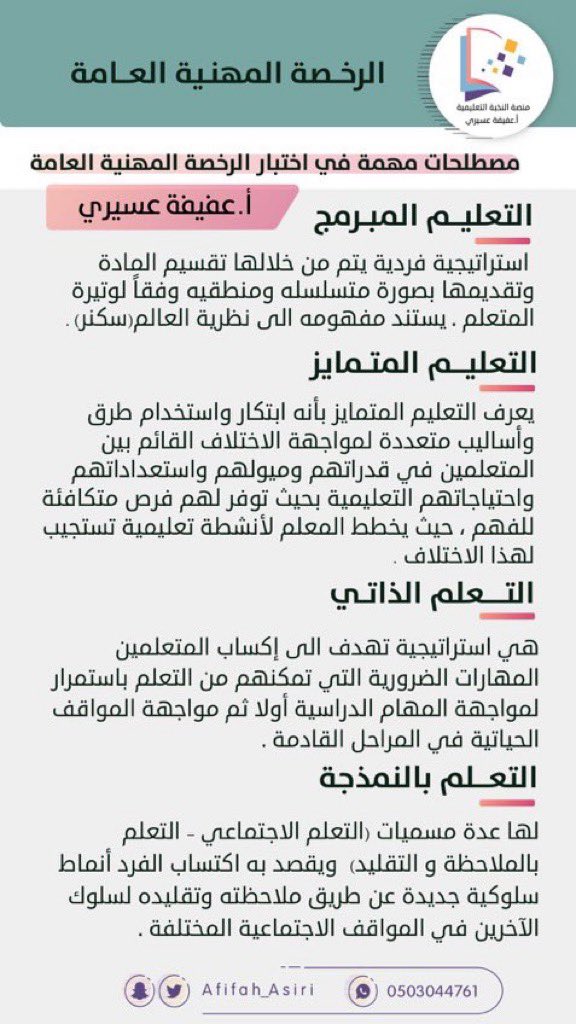 للمعلمين والمعلمات :في اختبار #الرخصة_المهنية ( التربوي) :- هنا أكثر شيء مهم في إختبار الرخصة ويتكرر دائماً .. احفظوها👌