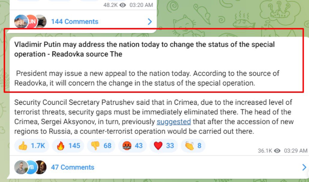 ظهرت إشاعات ولكن الكرملين نفى ذلك بسرعة هو أن بوتين سوف يغير من العملية العسكرية الخاصة لدخول بالمرحلة الثانية وهي مكافحة الإرهاب مثل ما فعلت بحرب الشيشان ويتبقى مرحلة ثالثة وهي إعلان الحرب الشاملة (التعبئة العسكرية)
