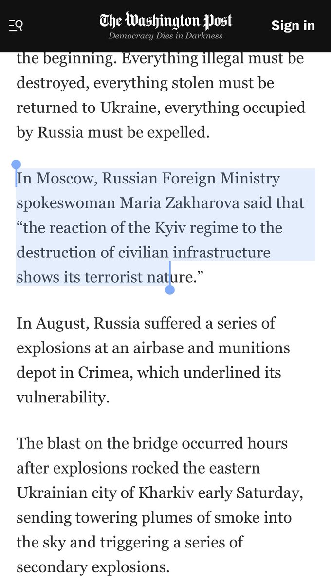 قام سكرتير مجلس الأمن القومي والدفاع الأوكراني، أوليكسي دانيلوف بنشر مقطعاً لانفجار جسر القرم وبجانبه مقطع للمغنية مارلين تغني بعيد ميلاد سعيد إشارة لإكمال بوتين عمره السبعين أمس.