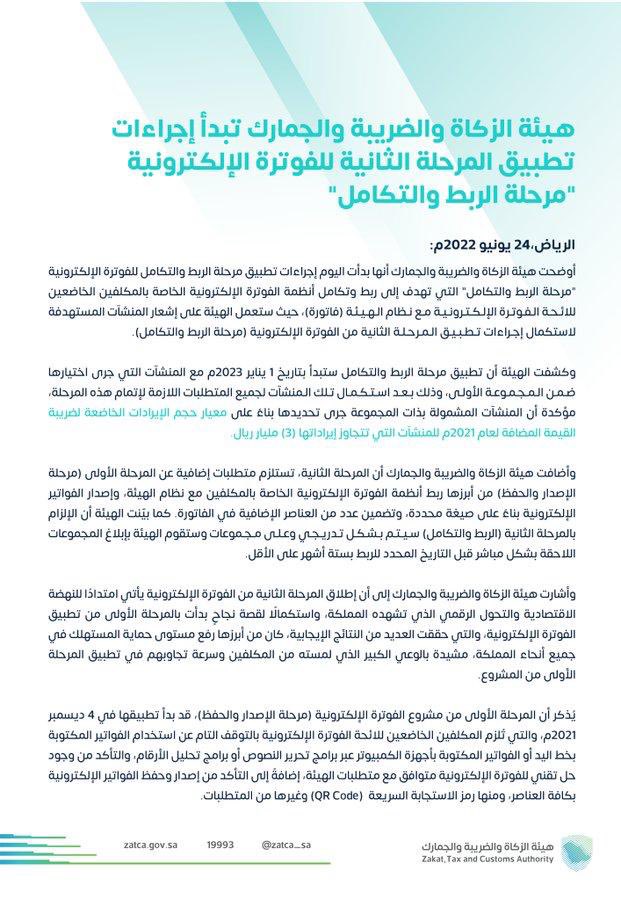 🔰بعد أن تم تحديد 1يناير 2023م ليكون تاريخ بدء تطبيق مرحلة "الربط والتكامل" على المجموعة الأولى للمنشآت التي إيراداتها لاتقل عن 3مليار.