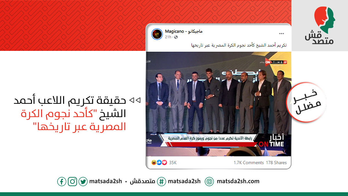 صورة منتشرة بشكل كبير جدًا لكابتن أحمد الشيخ، لاعب النادي المصري، وهو يقف على منصة تكريم رفقة عدد من الأشخاص، بينهم كابتن عماد متعب، لاعب الأهلي المعتزل، وأحمد دياب، رئيس رابطة الأندية المحترفة، مع تعليق: "تكريم أحمد الشيخ كأحد نجوم الكرة المصرية عبر تاريخها"،