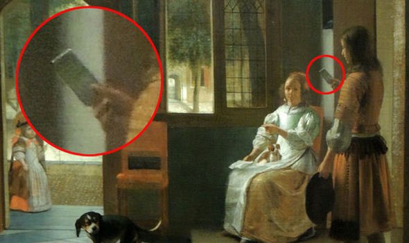 إنه جهاز يشبه الآيفون أثناء زيارته لمتحف بأمستردام، لكن الحقيقة أنه كتاب ديني اللوحة تعود لرسام الهولندي بيتر دي هوتش.