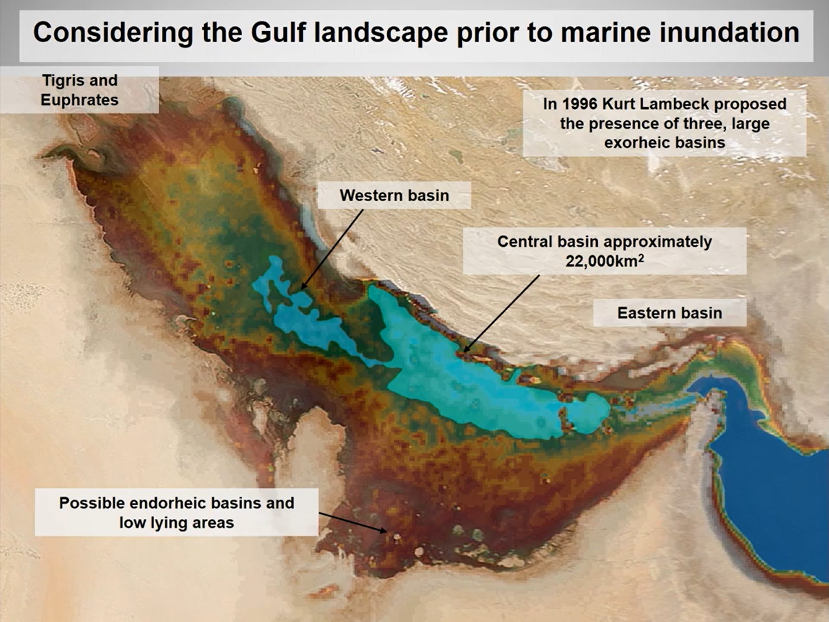 واحة حوض الخليج قبل أن تغمرها مياء البحر بالفترة بين 12.000 - 8000 سنة Gulf Oasis وهي تعتبر أحد الملاجئ المعيشية المحتملة للإنسان أثناء الذروة الجليدية الأخيرة LGM Refugium Richard Cuttler
