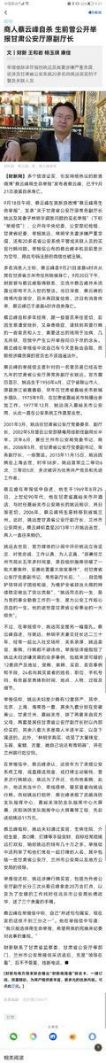 今天最大的新闻其实是旧闻。就是上月在微博举报了半个甘肃省公安厅,以及甘肃省前省委书记的举报人,蔡云峰,已于举报信发出后第三天,也就是微博清空他所有信息的第二天,坠楼身亡。这则新闻时隔半个月之后才爆出来。
