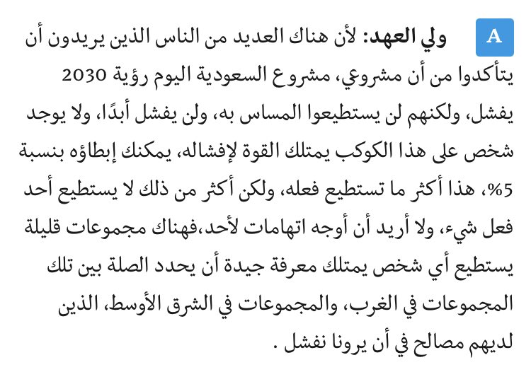 مصادر دخلها ومصادر تسليحها…لو كانت هذي النهضة المفاجئة بدعم أمريكي أو أوروبي راح تهون لأنها تحت نظرهم…لكنها جت مباغتة وبفعل يد السعوديين أنفسهم…فتخيل حجم الخطر بولادة كيان قادم في عدة مجالات صناعية ومناخية واستثمارية وثقافية وعسكرية…بدون ما يكون لك على الأقل يد قادرة على وقفه