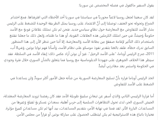 شهادة واضحة من السفير الامريكي في روسيا ايام اوباما حول ان الولايات المتحدة من مكنت روسيا في سوريا ومنعت وصول السلاح النوعي الى المعارضة .. وليس الخليج او الاردن او تركيا من منع ذلك او مكن روسيا ..