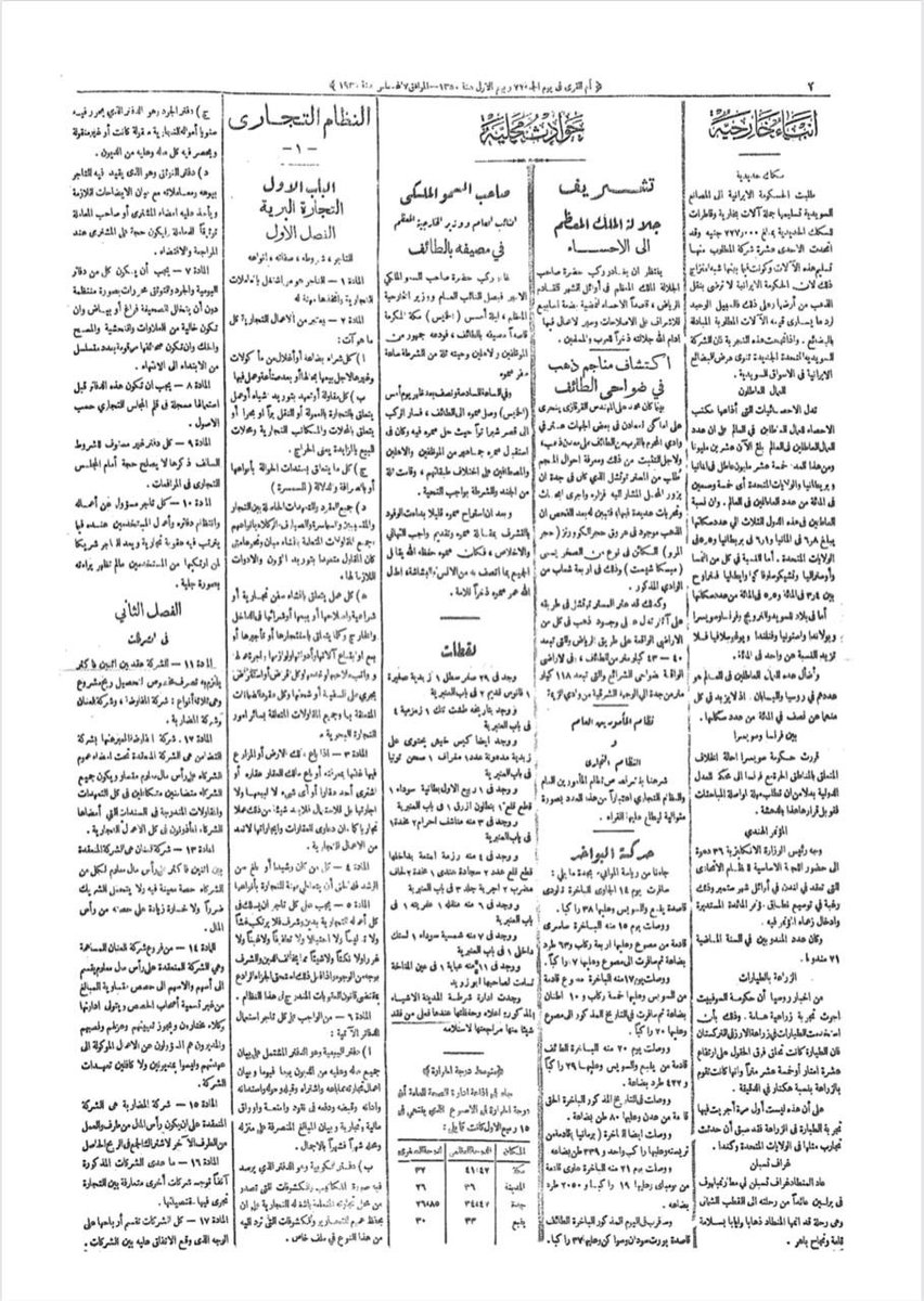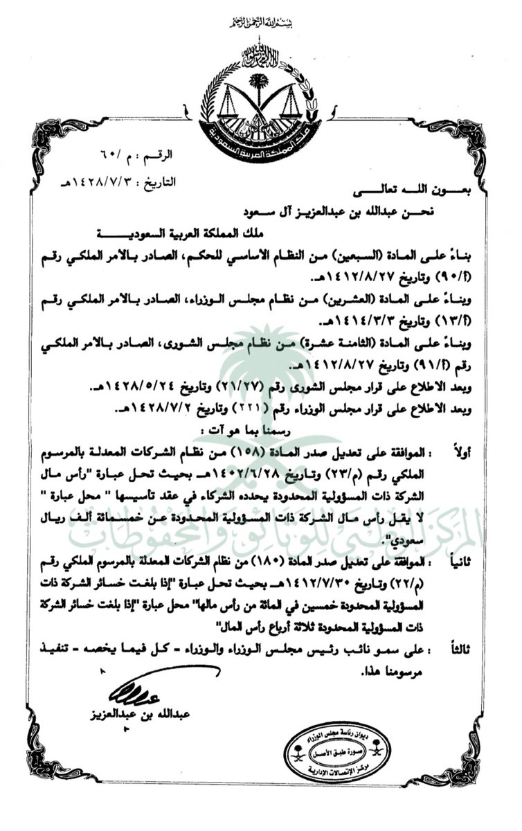 1- أول تنظيم للشركات في المملكة ورد في 7 مواد ضمن "النظام التجاري" الصادر عام 1350م-1931م المكون من 633 مادة، ولم يرد فيه تنظيم يتعلق بالشركة ذات المسؤولية المحدودة.