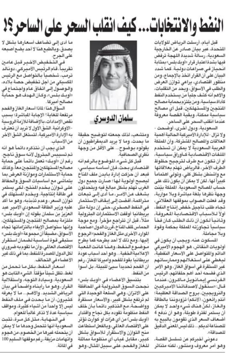 يُمكن القول بكل ارتياح أن إرهاصات قرار أوبك+ وما تبعه من حملة أمريكية محمومة كشف جلياً من يستخدم النفط كأداة سياسية 🇺🇸 ومن يلتزم بحماية مصالح المنتجين والمستهلكين قبل أي مصالح سياسية 🇸🇦، وبقية القصة معروفة عندما انقلب السحر على الساحر.