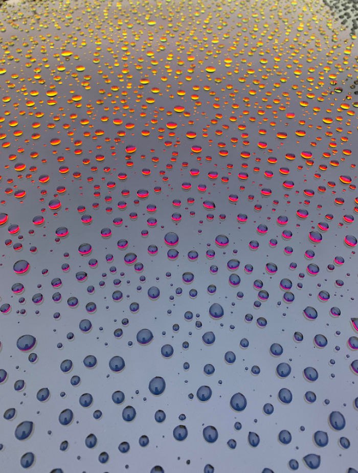 Droplets on a car windshield during sunset