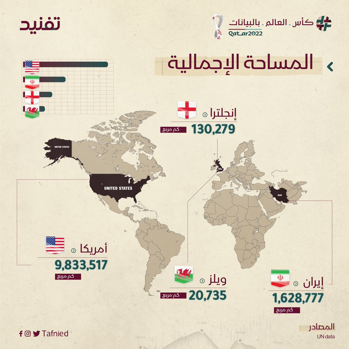 نقدم مقارنات بالبيانات بين الدول المتنافسة في بطولة #كأس_العالم 2022 بمجالات متعددة (ديموغرافية -اقتصادية - سياسية - معرفية) ونتابع معكم بـ #المجموعة_الثانية لتكون المنافسة بين #إنجلترا #إيران #أمريكا #ويلز