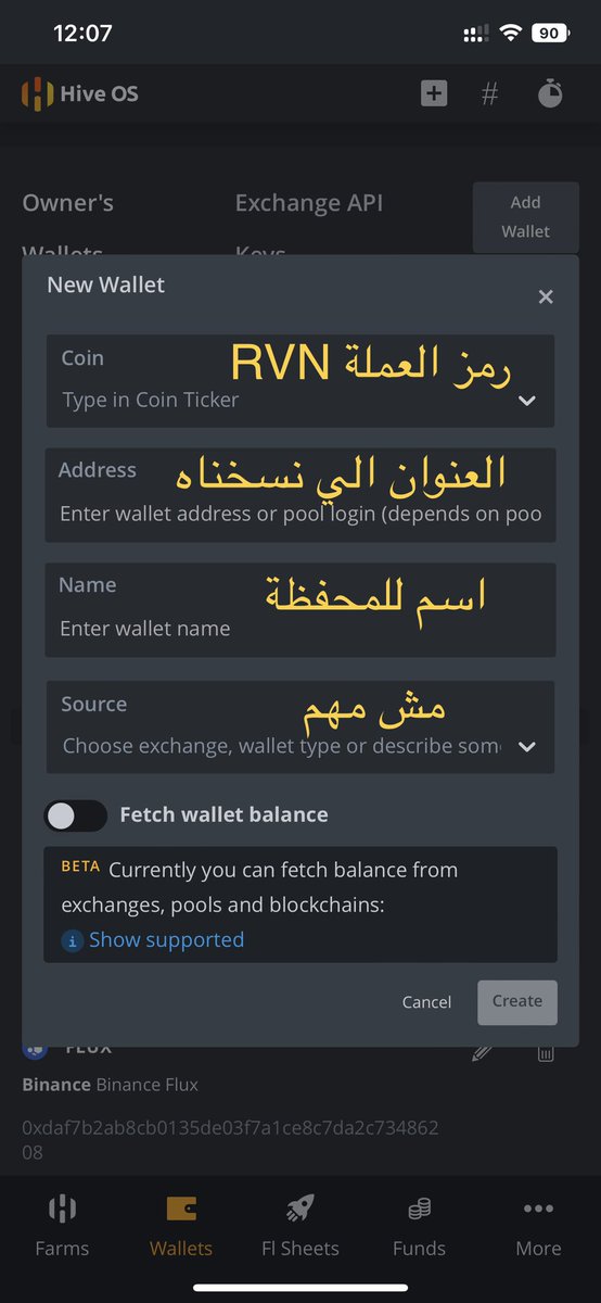 نقوم بالضغط على اضافة wallet نختار عملة RVN من القائمة