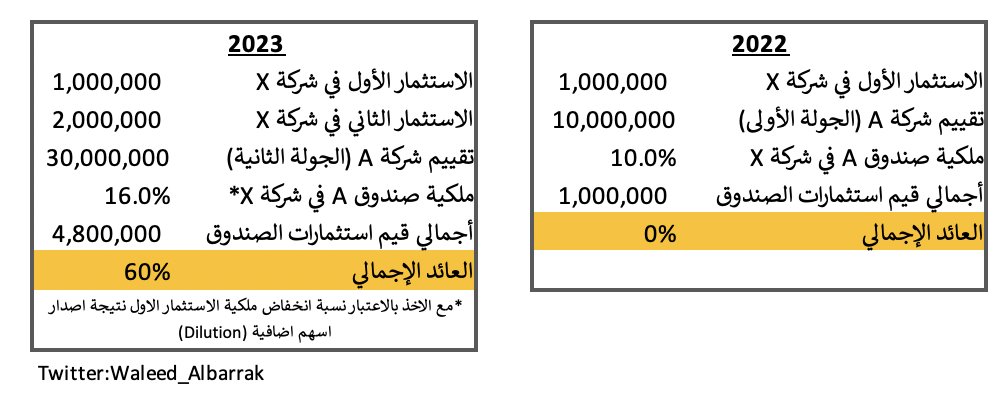 1) لنفترض أن صندوق X استثمر مليون في شركة A بتقييم 10 مليون