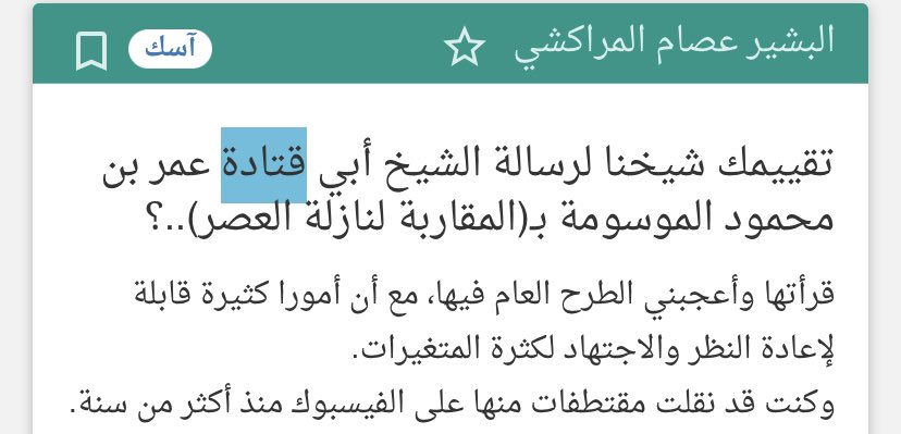٢-بمراجعة سريعة لأفكار المراكشي، يتبيّن أنه يعتبر (أبا قتادة الفلسطيني) و(أبا محمد المقدسي) من أفاضل أهل العلم والدعوة ويجيب عن هذا في الآسك بصراحة 👇