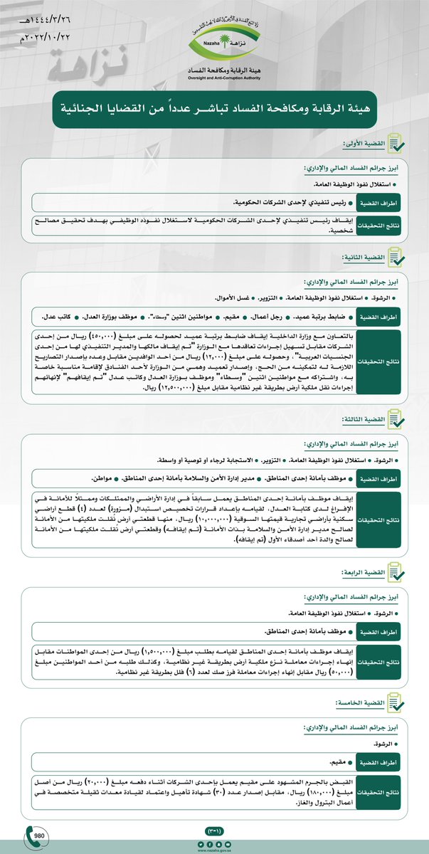 صرّح مصدر مسؤول في هيئة الرقابة ومكافحة الفساد بأن الهيئة باشرت عدداً من القضايا الجنائية خلال الفترة الماضية، وجارٍ استكمال الإجراءات النظامية بحق مرتكبيها، وكانت أبرز القضايا على النحو الآتي: