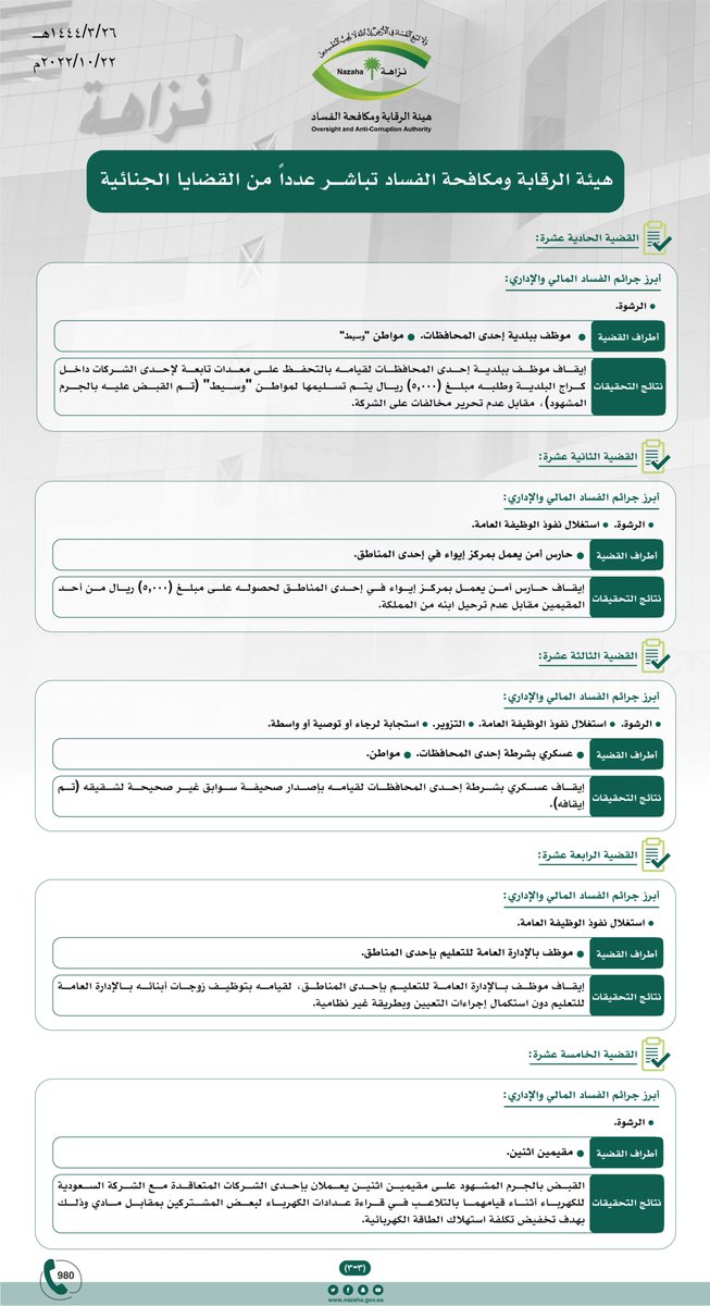 بالتعاون مع وزارة الداخلية إيقاف ضابط برتبة عميد لحصوله على 450,000 ريال من إحدى الشركات مقابل تسهيل إجراءات تعاقدها مع الوزارة "تم إيقاف مالكها، والمدير التنفيذي لها من إحدى الجنسيات العربية"، وحصوله على 12,000 ريال من أحد الوافدين مقابل وعده بإصدار التصاريح اللازمة له