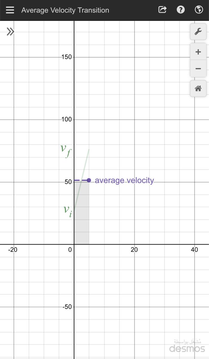 صفحتان على @Desmos لتمثيل معادلات الحركة الخطية والسرعة المتوسطة، مع التحكم بالقيم وحساب الميل والمساحة تحت المنحنى واظهار ما تمثله الكميات في المعادلات.