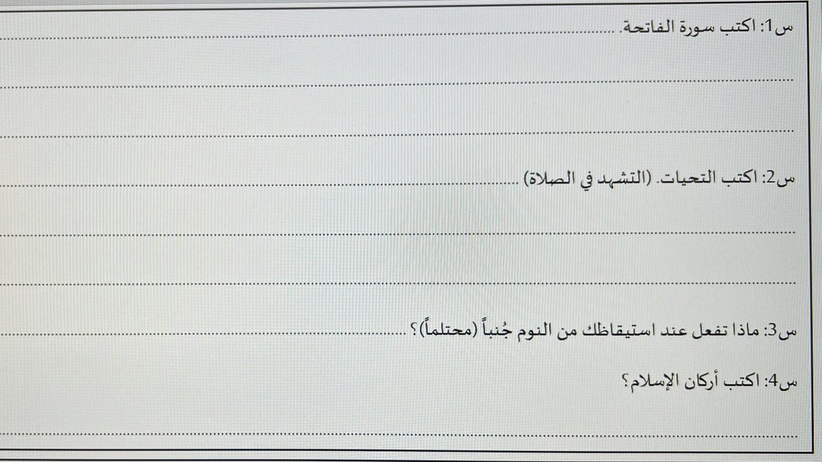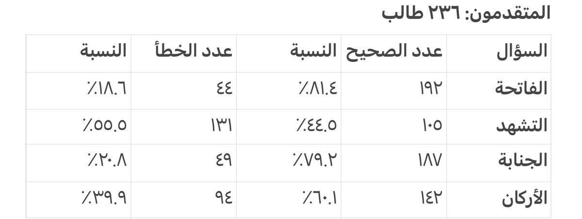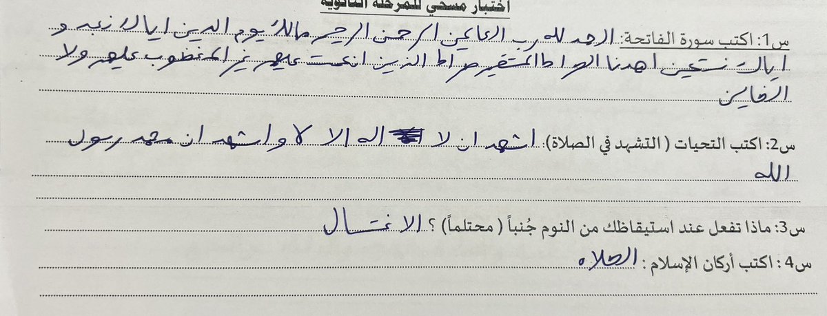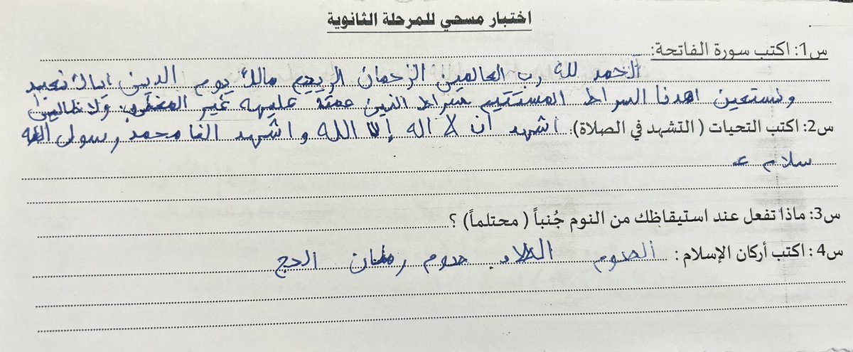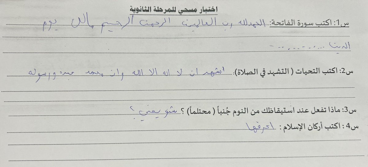 ٩٤ طالباً لم يكتبوا أركان الإسلام كاملة سواء ينسى واحدة أو اثنتين أو يكتب أركان الإيمان بدلاً عنها.