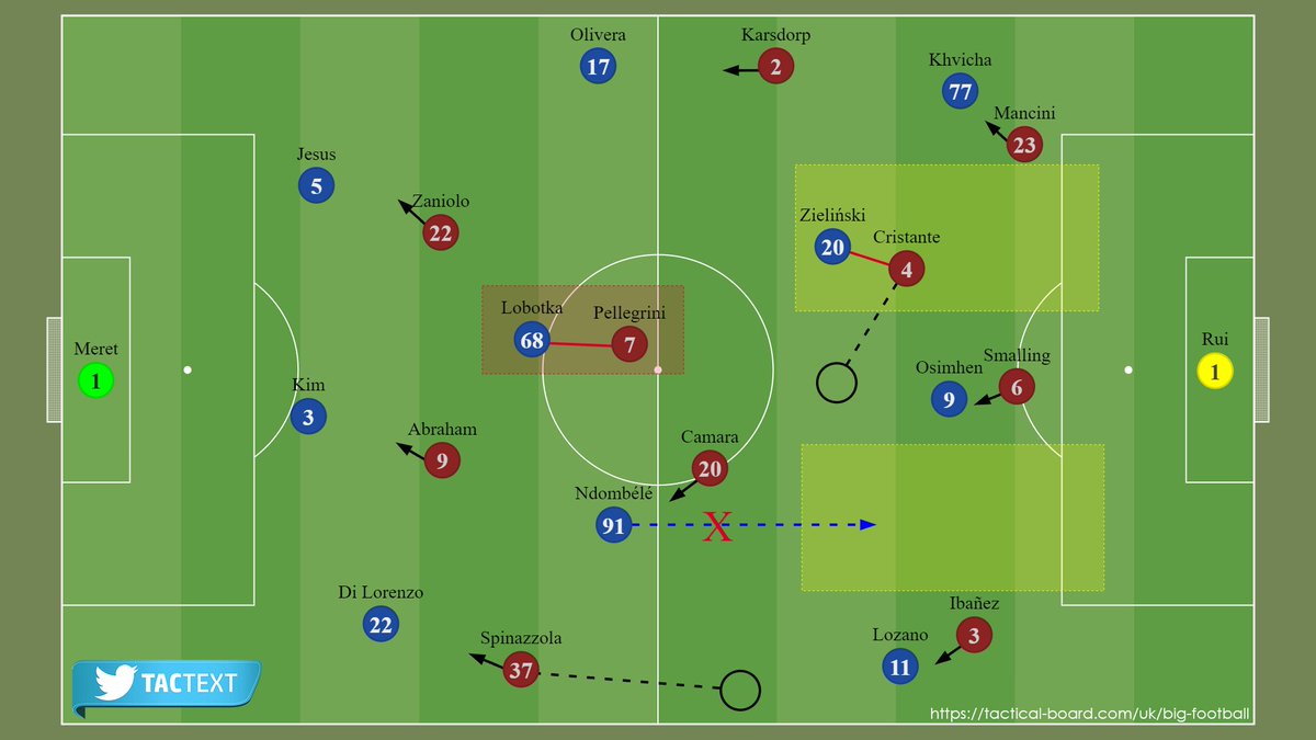 ▪️ بعد نحو 30 دقيقة تقريباً؛ حاول سباليتي منح ندومبيلي أريحية أكبر في التقدم للأمام وذلك من خلال تبادل الأدوار الجيد بينه وبين دي لورينزو مع توسيع لوزانو للملعب؛ وبالتالي استطاع الفرنسي إيجاد بعض المساحة في مناطق #روما وتسبب في ركلة جزاء قبل إلغاءها