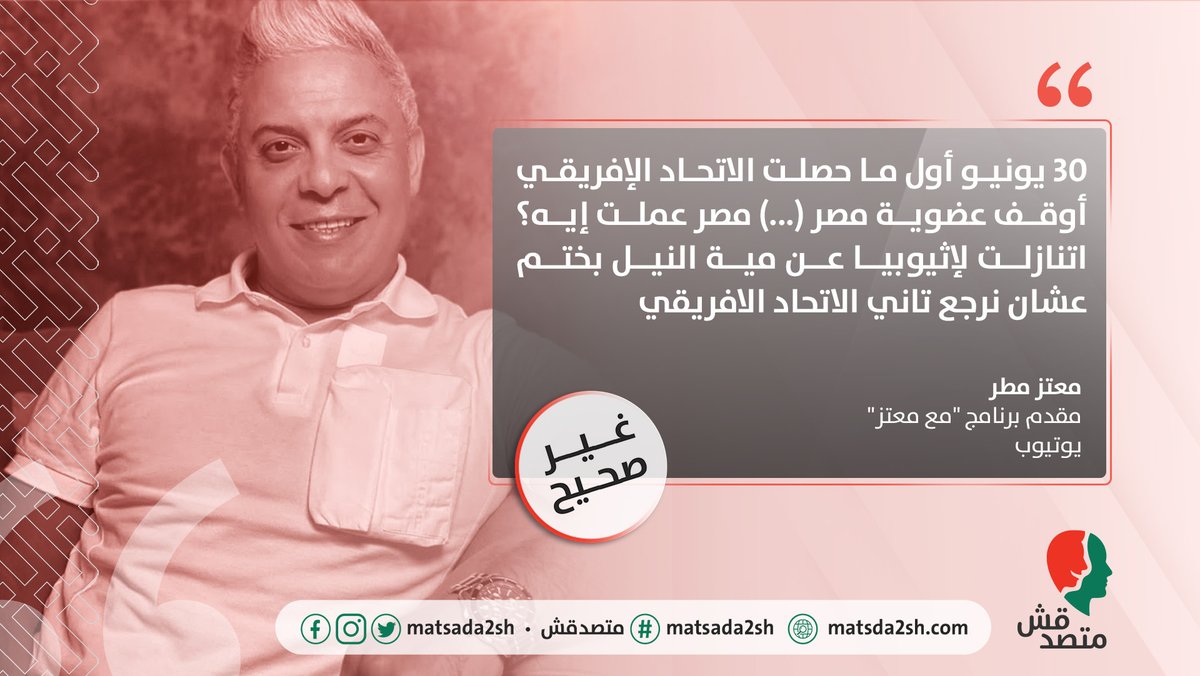 - الكلام ده غير صحيح. الاتحاد الأفريقي ألغى تجميد عضوية مصر في يونيو 2014، عقب الانتخابات الرئاسية التي أسفرت عن فوز السيسي برئاسة الجمهورية، وكان هذا قبل توقيع اتفاقية مبادئ سد النهضة بـ9 أشهر. ✅✅ @moatazmatar