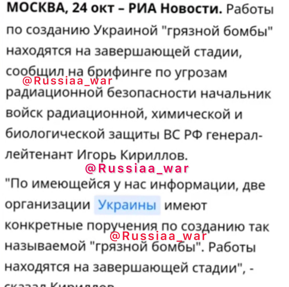 ملحوظة: الأمريكيين والبريطانيين لا ينكرون وجود قنبلة. وكل أجاباتهم كانت سوف نحقق عن ماذا قدمت شركاتنا لاوكرانيا. بمعنى أنهم لا ينفون. بمعنى كانوا يعلمون ادق ادق ادق تفاصيل مراحل تصنيع القنبلة القذره وهذا يأكد ان زيلينسكي الغبي الآن يملك قنبلة نووية تكتيكية واحدة.