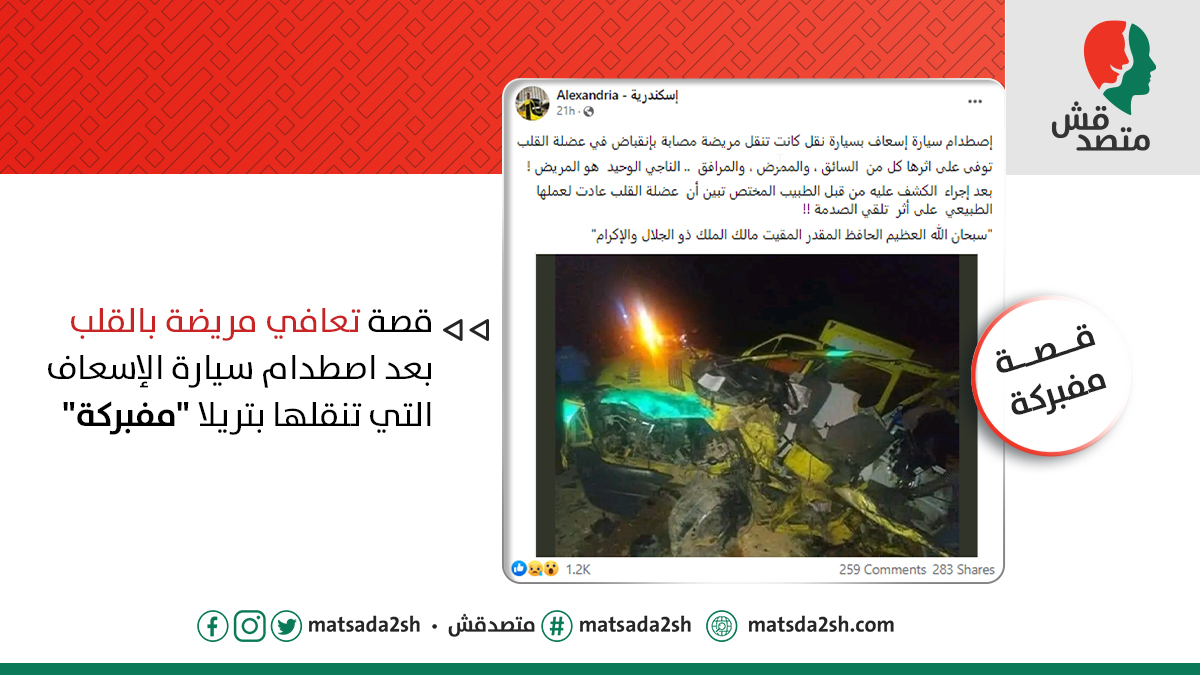 - دي قصة مفبركة. الحادثة قديمة تعود إلى يونيو 2019، والمريضة تُوفيت في الحادثة. ✅✅