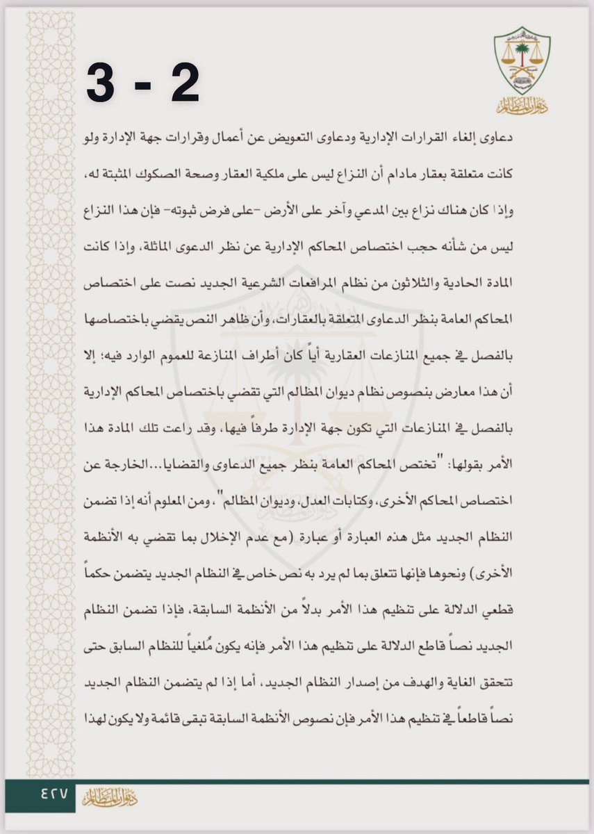4/ "تختص المحاكم العامة بنظر جميع الدعاوى والقضايا والإثباتات الإنهائية وما في حكمها الخارجة عن اختصاص المحاكم الأخرى وكتابات العدل وديوان المظالم". ولو نص النظام الجديد على نص قطعي ينظم هذا مسألة ما فالسابق ملغي، أما إن لم يحدث ذلك فالحكم القديم يظل سارياً لعدم تعارضه مع الجديد.