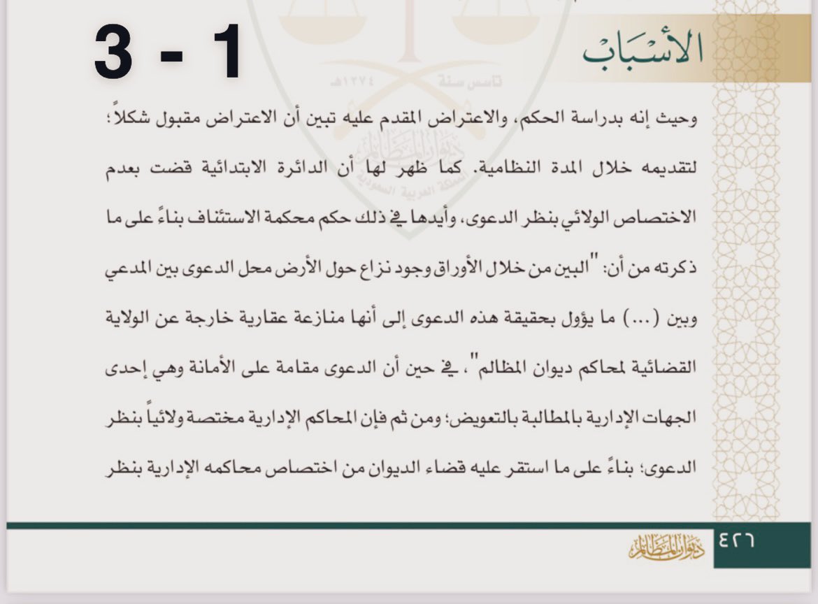 1/ نقضت المحكمة الإدارية العُليا حكم محكمة الاستئناف الإدارية التي حكمت بعدم اختصاصها ولائياً بالفصل في الدعوى المنظورة لأنها منازعة عقارية برغم أن أحد الأطراف "جهة إدارية" وهي "الأمانة"، ويدور الأمر حول مطالبة بالتعويض. وعلّلت المحكمة الإدارية العلُيا هذا النقض بتعليلات عديدة،
