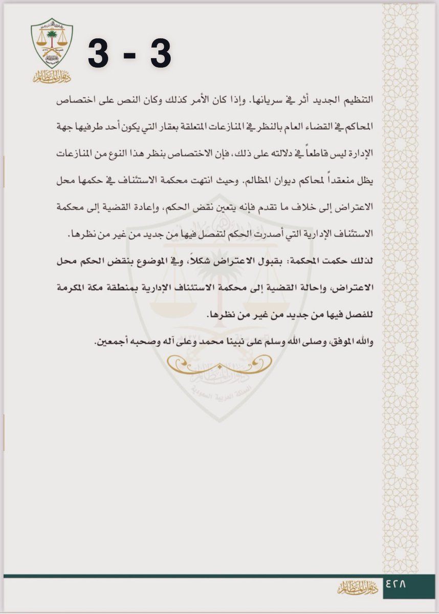 3/ والنص الخاص الوارد في نظام ديوان المظالم نص على أن القضاء الإداري يختص بالفصل في المنازعات التي تكون جهة الإدارة طرفاً فيها، وأتى الحكم القضائي بحجة قانونية سليمة ألا وهي أن نظام المرافعات الشرعية بذاته قد راعى هذا الأمر وذلك من خلال نص صريح ومباشر إذ قال بأحد مواده ما يلي: