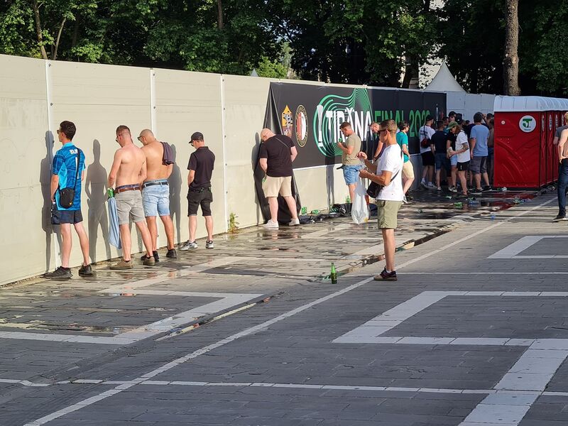 سيدة مشرده تفترش الرصيف وتقول (ساعدوني) ليأتي رجل متقدم في العمر ليرشها بالماء البارد لتنصرف.