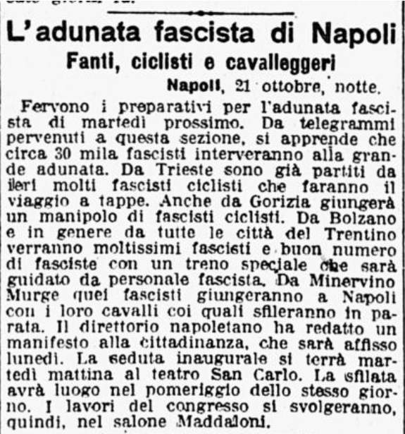 Santa Marinella, Monterotondo, Tivoli e Foligno saranno le località di concentramento delle colonne. La marcia su Roma è decisa, manca solo la data.