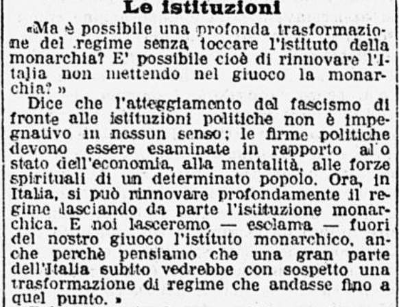 «Il Fascismo è una grande forza, ha il diritto alla rappresentanza in seno ai principali organi statali e parlamentari. Il fascismo non attacca e non combatte lo Stato da nemico. Il primo mezzo per calmare le “esuberanze” fasciste è quello di condurre i fascisti al potere».