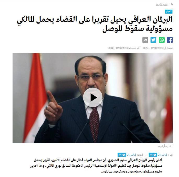 في عام 2014 لم يترك المالكي رئاسة الوزراء إلا تحت ضغط شعبي وسياسي جارف، وفي 2015 أحال البرلمان العراقي إلى القضاء الاثنين، تقريرا يحمل مسؤولية سقوط الموصل بيد تنظيم "الدولة الإسلامية" لنوري المالكي، و35 من معاونيه.