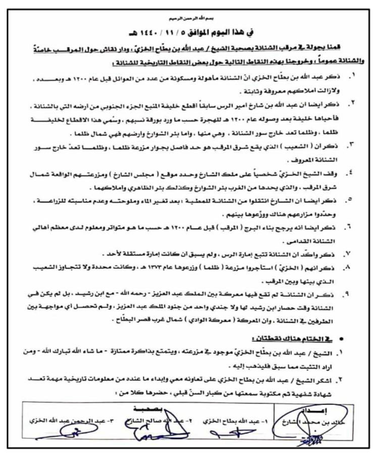 من الوثائق المتداولة عن بعض أملاك الرشيد #بالشنانة كمثال ونموذج [وقفية مزنة بنت محمد بن عبدالعزيز الرشيد] المكتوبة عام 1350هـ وكاتبها هو القاضي عبدالعزيز بن ناصر الرشيد.
