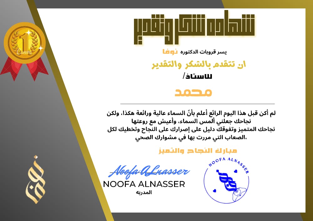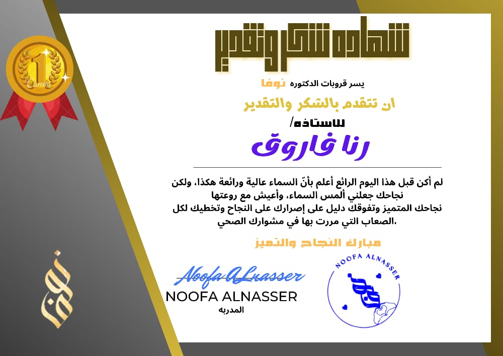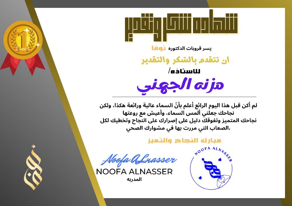 ٠✨️❤️🙏🏻لا أستطيع التعبير عن مدى فخري وامتناني بوجود معي هالكوكبه المتميزه فقد أستطاعت تخطي العبقات واستطاعت التغلب على السمنه بكل قوه وعزيمه واصرار وكانت خير مثال وظهرت بأفضل صورة يقتدي بها الآخرين جميعاً.في الحفاظ على صحتهم اتمنى ان تقبلو مني هذا التكريم البسيط