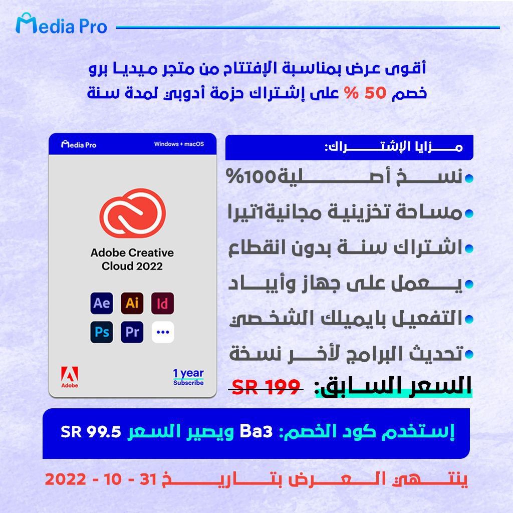 واذا انت لسا ما حملت برامج أدوبي فلا يفوتك هذا العرض واللي يعطيك اشتراك بجميع برامج أدوبي لمدة سنة فقط ب99.5 ريال👇🏻