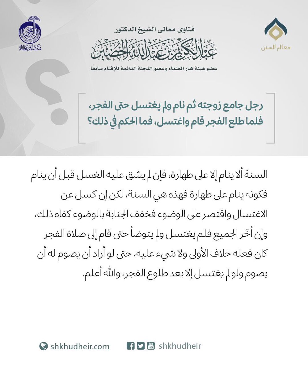 رجل جامع زوجته ثم نام ولم يغتسل حتى الفجر، فلما طلع الفجر قام واغتسل، فما الحكم في ذلك؟
