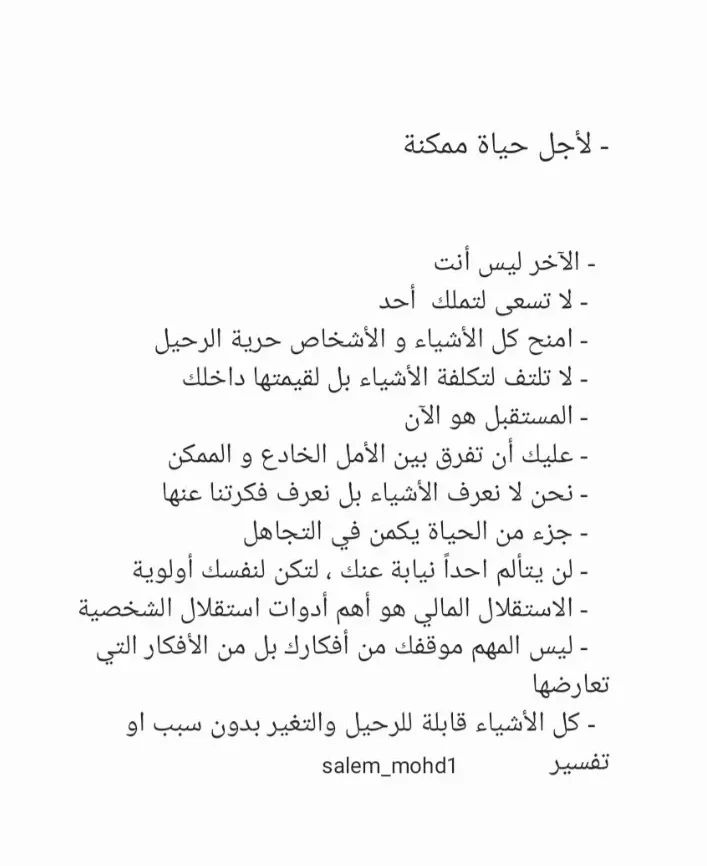 كل شيء يعتمد عليك ، يعتمد على فهمك ، الحياة ليست جميلة او قبيحة ، الألم كامن داخلك ، بيدك أن تتعافى ، بيدك أن تحمي داخلك ، عليك أن تبحث داخلك عن أشياء ثابتة تواجه بها عالم متغير بطبيعته ، كل سوء فهم للحياة هو سوء فهم لطبيعتها ، كل سوء فهم هو ألم