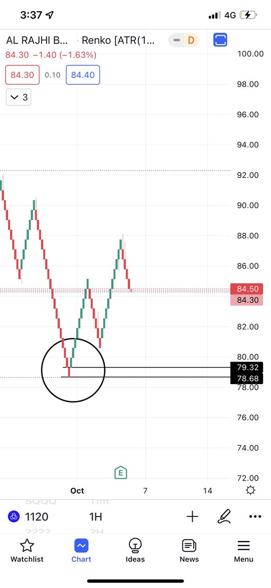 بالمثال السابق الصورة لنفس السهم وهو الراجحي لذالك لاحظنا بالدائرة ارتداد السهم الحقيقي من شموع الرينكو على فاصل ساعه مع ان الشموع اليابانيه المفرغة المعتادة اعطانا ارتدادات وهميه.