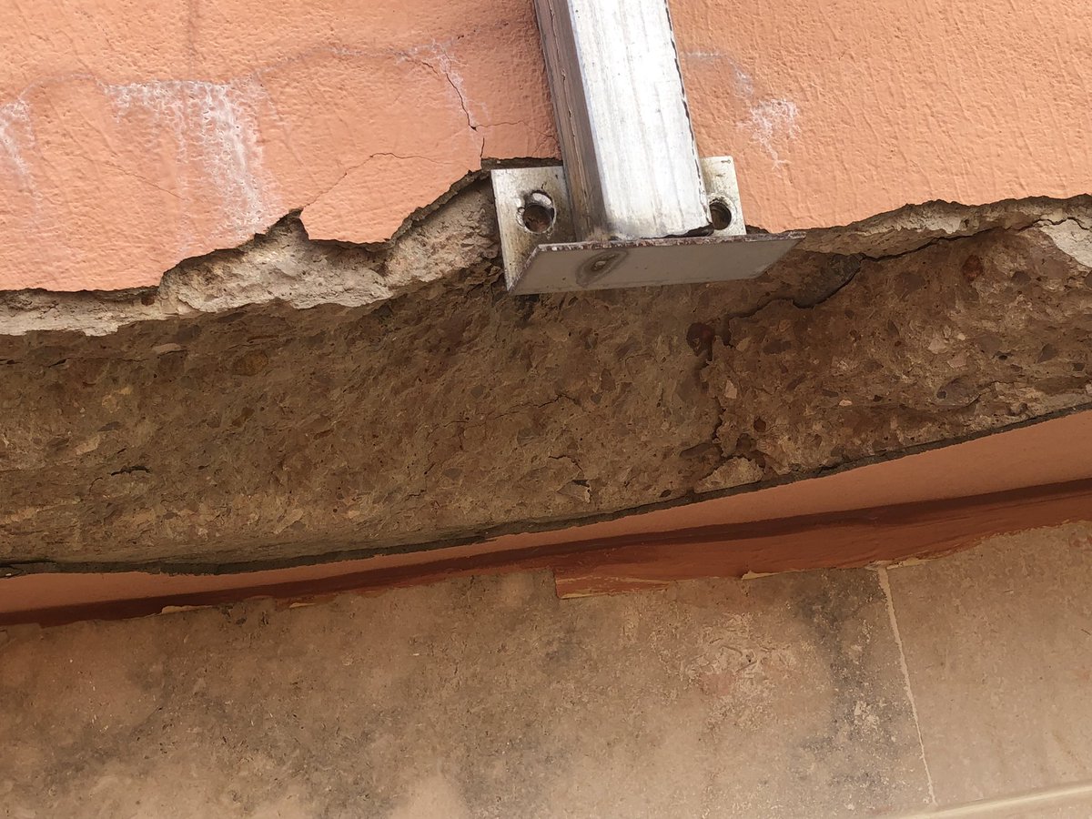 بحديد البناء. بهالحالة حديد البناء ممكن كتير يحمى ويفقع. الصاعقة متل ما مبيّن بالصورة كسرت حرف الباطون. وطبعا" خلّفت أضرار بنظام الطاقة وكل شي تاني (كهرباء، تلفون، تلفزيون) من وراء التيار المخلوق بالكابلات.