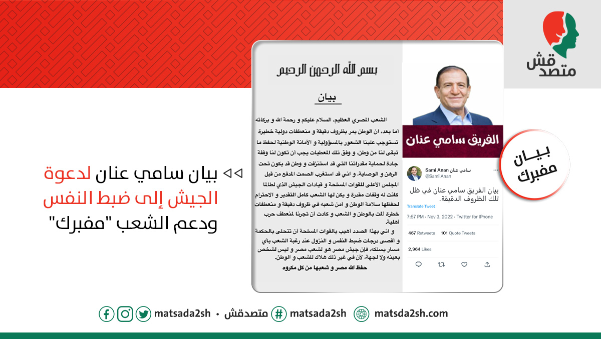 - بيان منتشر بشكل كبير منسوب إلى الفريق سامي عنان، رئيس أركان الجيش المصري الأسبق، نشره حساب "تويتر" يحمل اسم الفريق عنان، مكتوب فيه: