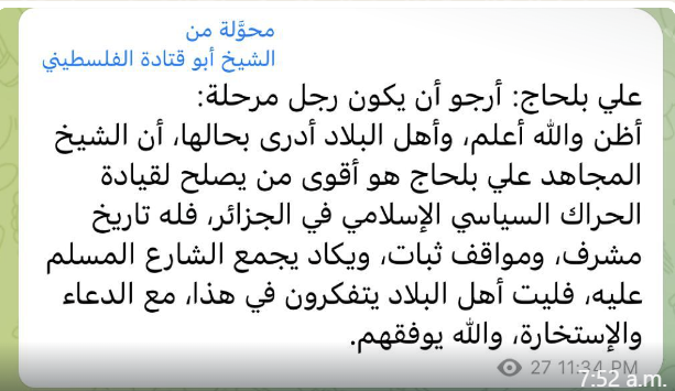 3⃣(بالطبع!) والقصة التي نشرها اسمها " ميرسو.. تحقيق مضاد). والشيخ الذي أفتى بردته وطالب السلطة بإقامة الحدّ عليه هو الشيخ بلحمداش الجزائري. فقام وأفتى في حقيقة ذاك المر* تد، فانبرى بلحاج للدفاع عنه!! حتى قال كلمته 2014 التي هو معلوم حال قائلها في فقه المسلمين👇
