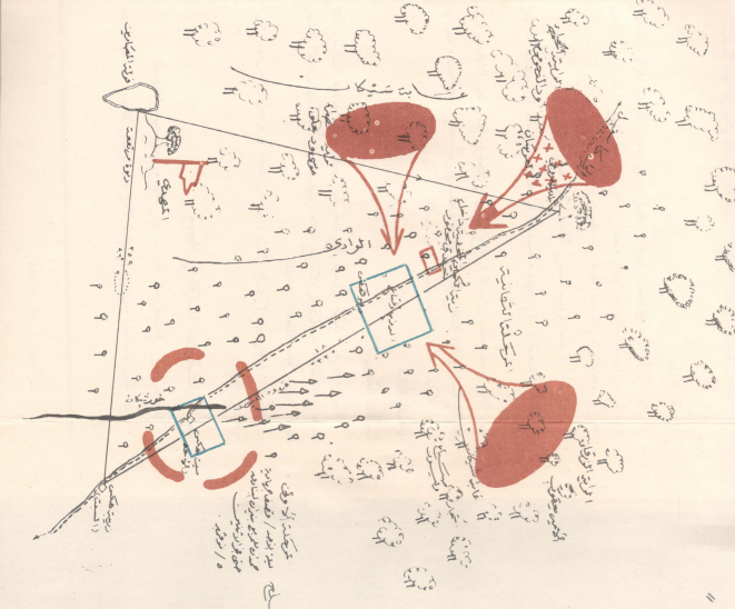 لضرب الضلع الخلفي وخاصة لما شافهم واقفين ما عندهم نية التقدم والالتحام فناداى الاميرلاي سليم عوني انو يلحق الضلع الخلفي ويقفل الثغرة و أمر قادة الضلعين الأيمن والايسر انهم ينثنو للداخل و يلتحموا ويكونوا شكل مثلث بمقدمة حادة .