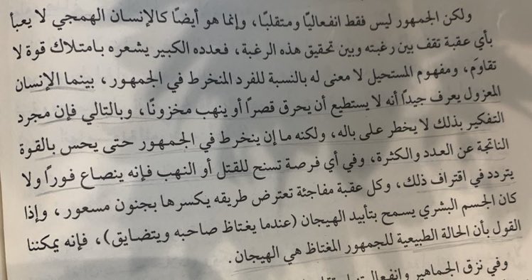 قيل: "أن الفرد المنخرط في الجمهور هو عبارة عن حبة رمل وسط الحبات الرملية الأخرى التي تذروها الرياح على هواها" 📖