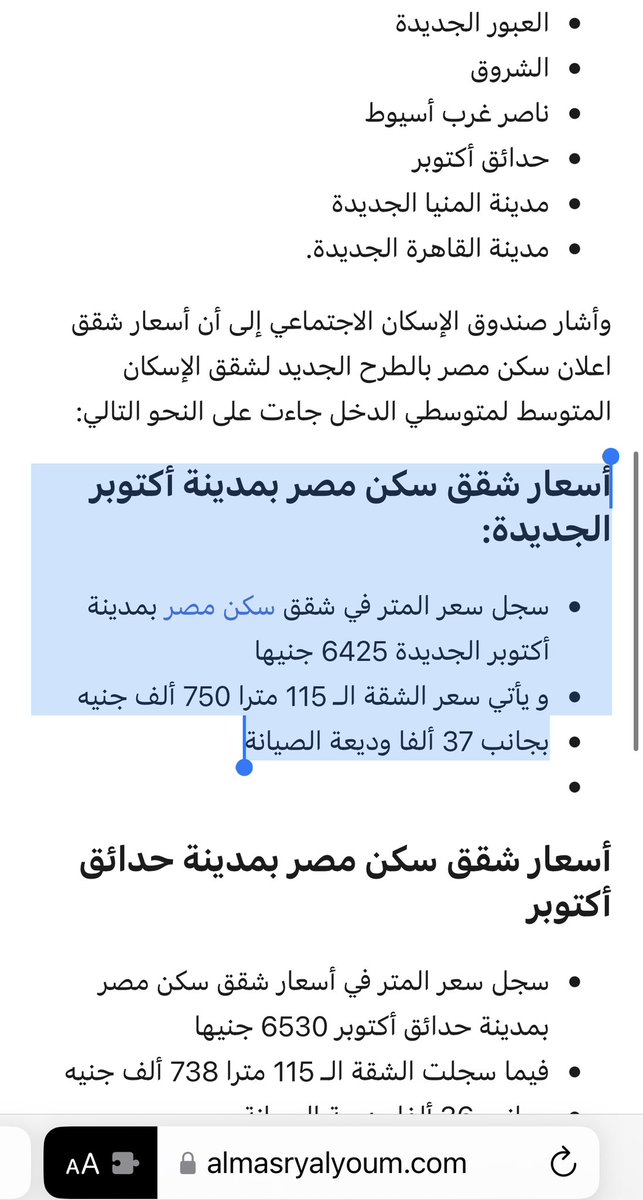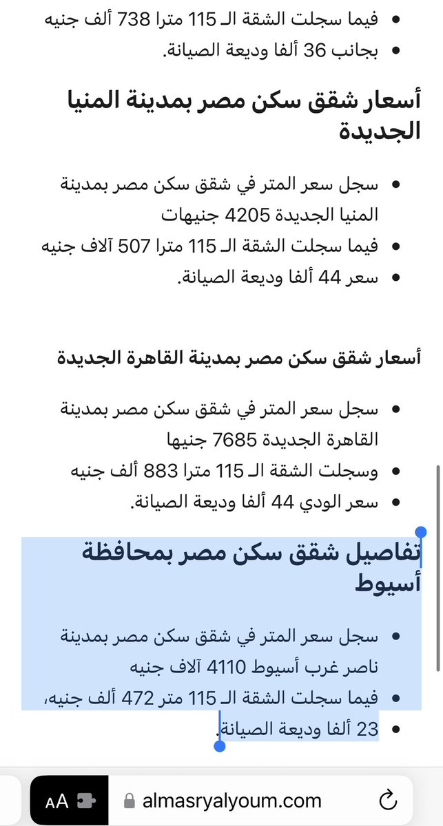 ٥- أسعار شقق سكن مصر لمتوسطي الدخل بمحافظة أسيوط:
