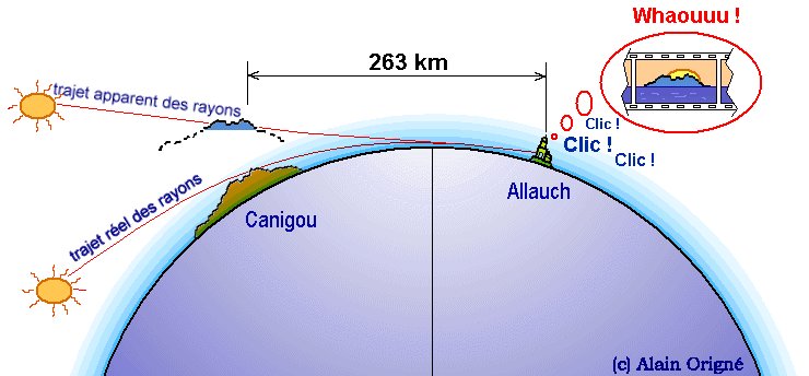 💡هل تعلم: أن جبل كانيجوCanigouبفرنسا والبالغ ارتفاعه 2785م يمكن مشاهدته أثناء غروب الشمس مرتين كل عام في بدايات شهر2ونهايات شهر10من مدينةألوشAllauchالتي تبعد عنه مسافة263كم؟ وأن جمعاً من الناس يحتفلون بهذا المشهد العجيب حيث يفترض عدم ظهوره حسب تكور الأرض؟