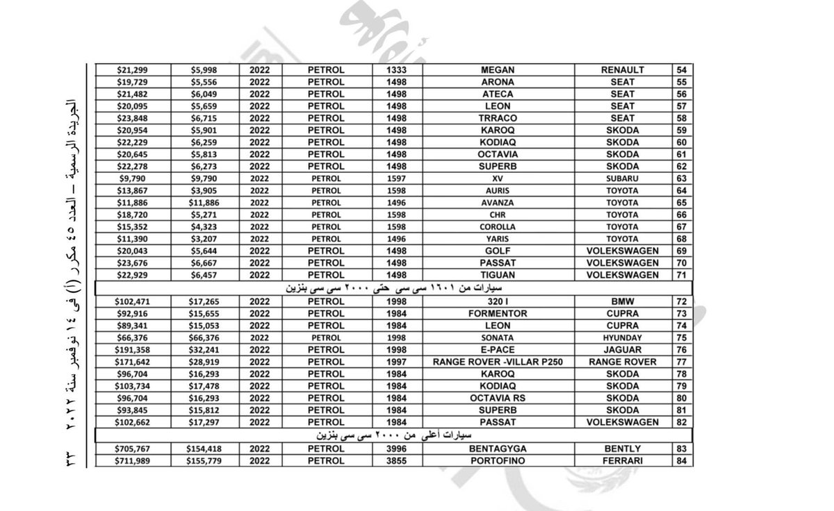 🛑 جداول المبالغ المالية المستحقة لاستيراد سيارات المصريين في الخارج بدون جمارك في صورة وديعة تُسترد بعد 5 سنوات