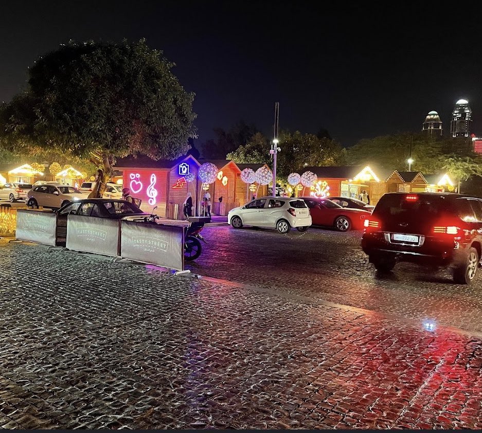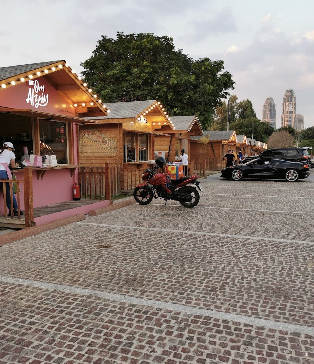 شارع بطراز بسيط وفيه متاجر على شكل اكواخ لمطاعم ومقاهي كلها طلبات خارجية 🛖