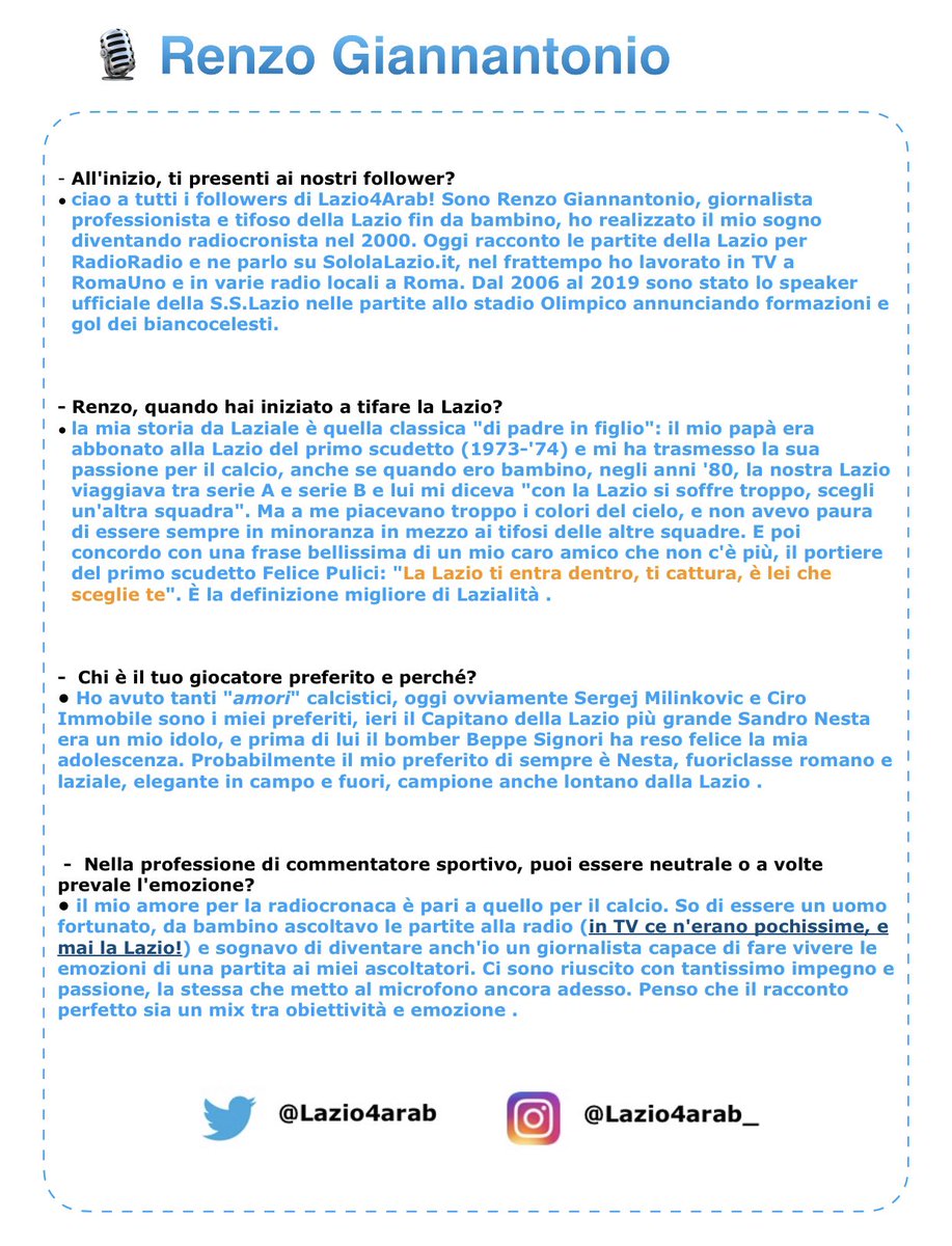 مرحبا بكل متابعي #لاتسيو_للعرب ، انا رينزو جيانانتونيو صحفي ومشجع لاتسيالي منذ طفولتي ، حققت حلمي بأن اصبح معلقاً اذاعياً في عام ٢٠٠٠ واليوم اعلق على مباريات لاتسيو في اذاعة @RadioRadioWeb كما اتحدث باستمرار عن لاتسيو في @Solo_La_Lazio ..