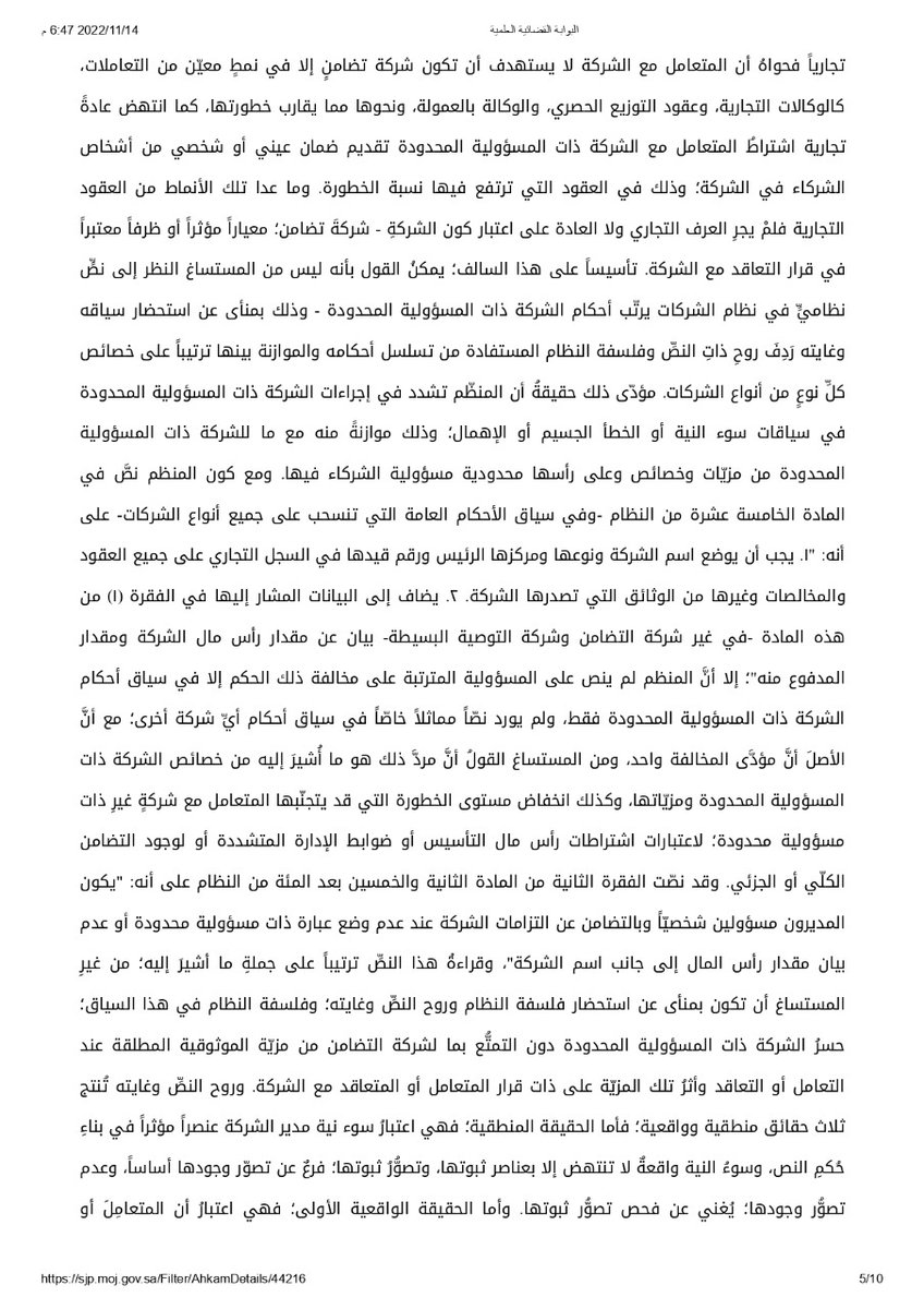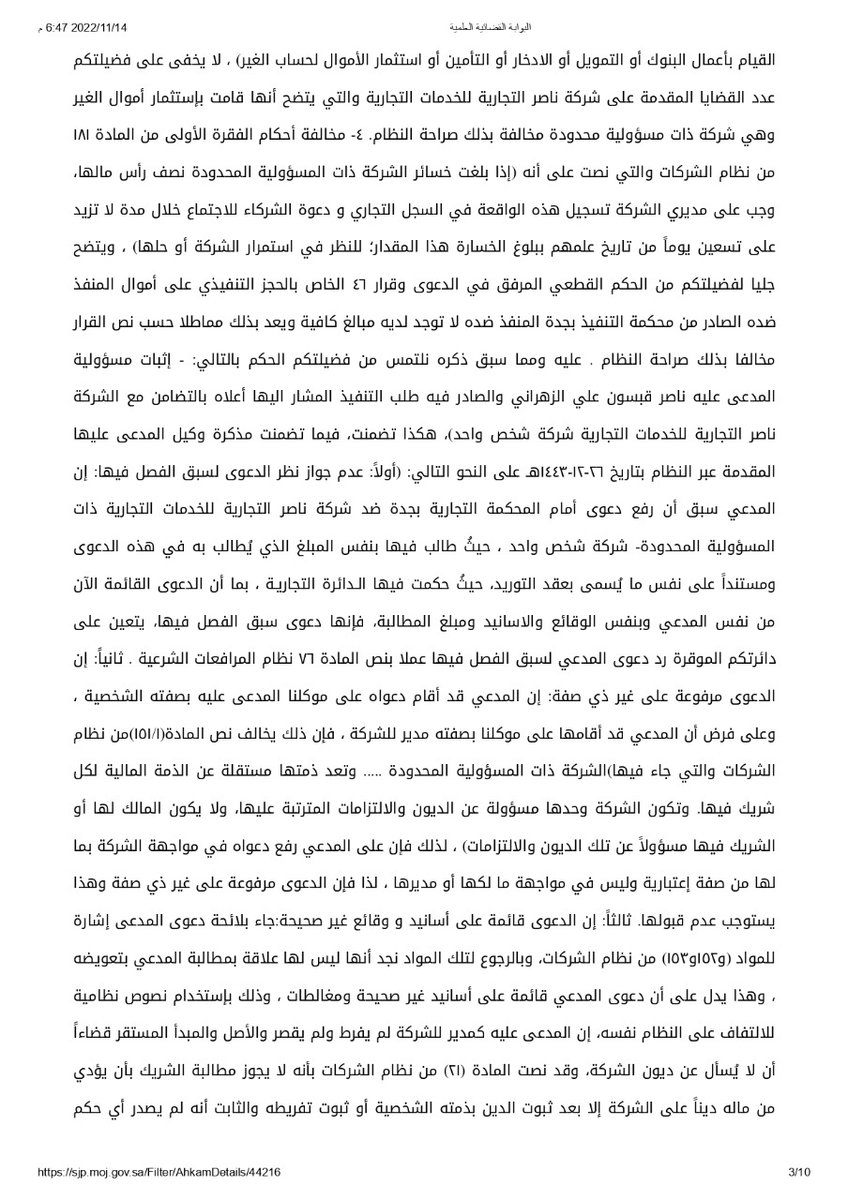 المدعي: يطلب تضمين المدير دين الشركة؛ لعدم كتابة عبارة ذات مسؤولية محدودة ومقدار رأس المال.
